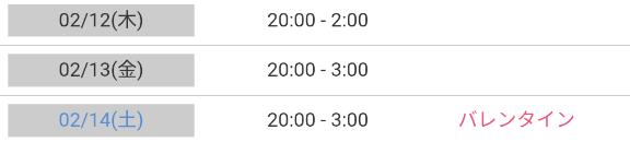 | 2月4日(水) | 15:00 ~ 02:00 |